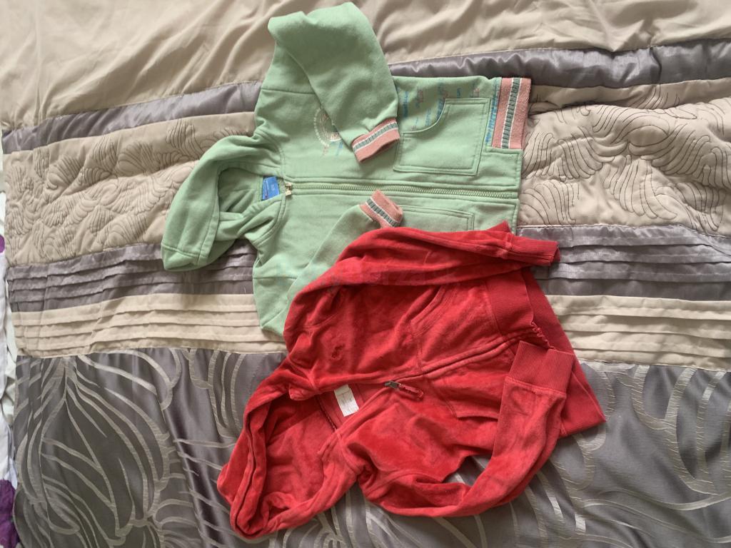 Cervena mikiny H&M 122/128, je na nej mala dierka. Zelena 128. Na donosenie, cena je za obe spolu